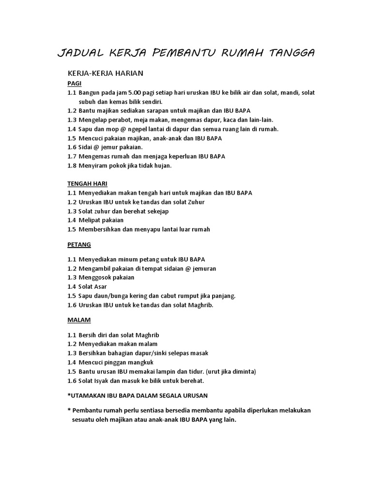 Contoh Jadual Kerja Pembantu Rumah / Inilah Jadual Kerja Pembantu Rumah Terupdate / Lewat sebuah biro tenaga kerja, sore itu datanglah seorang wanita sekitar 35 tahunan, sumiyati namanya, berasal dari wonogiri dan sudah punya dua anak yang tinggal bersama ortunya di desa.. Kali ini kami akan memberikan melalui situs resmi kita dapat mengisi form lamaran kerja sesuai data diri kita. Lima bulan telah saya kerja menjadi seseorang pembantu rumahtangga di keluarga pak umar, saya memanglah bukan seseorang yang makan pengetahuan bertumpuk, cuma lulusan sd saja di kampungku. Saya doakan agar mendapatkan posisi. Beberapa blog berkenaan pembantu rumah, so harini nak berkongsi cerita pasal mereka ni. Artikel kali ini akan membahas contoh surat kontrak kerja dan cara mudah membuatnya.